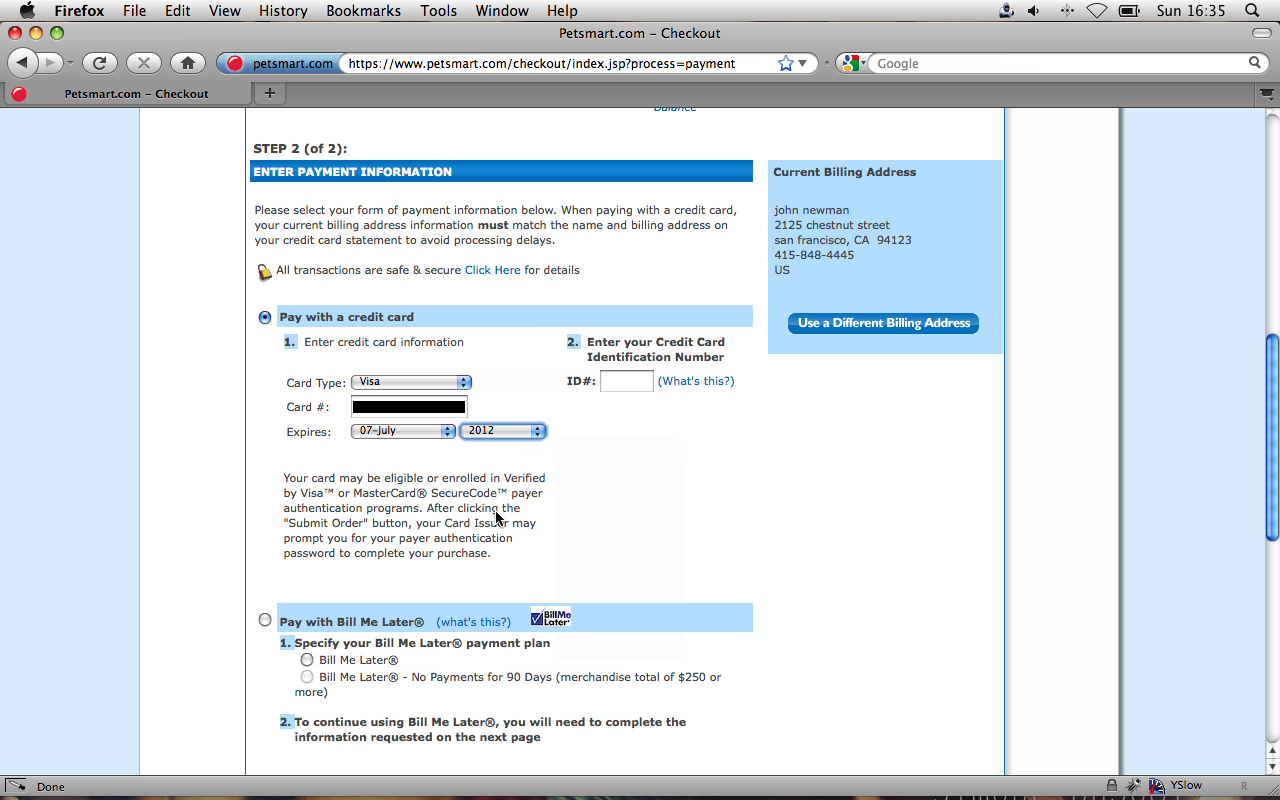 Another example is PetSmart. There, the most common behavior was to overlook the second column, with the “Credit card identification number,” resulting in an error message: